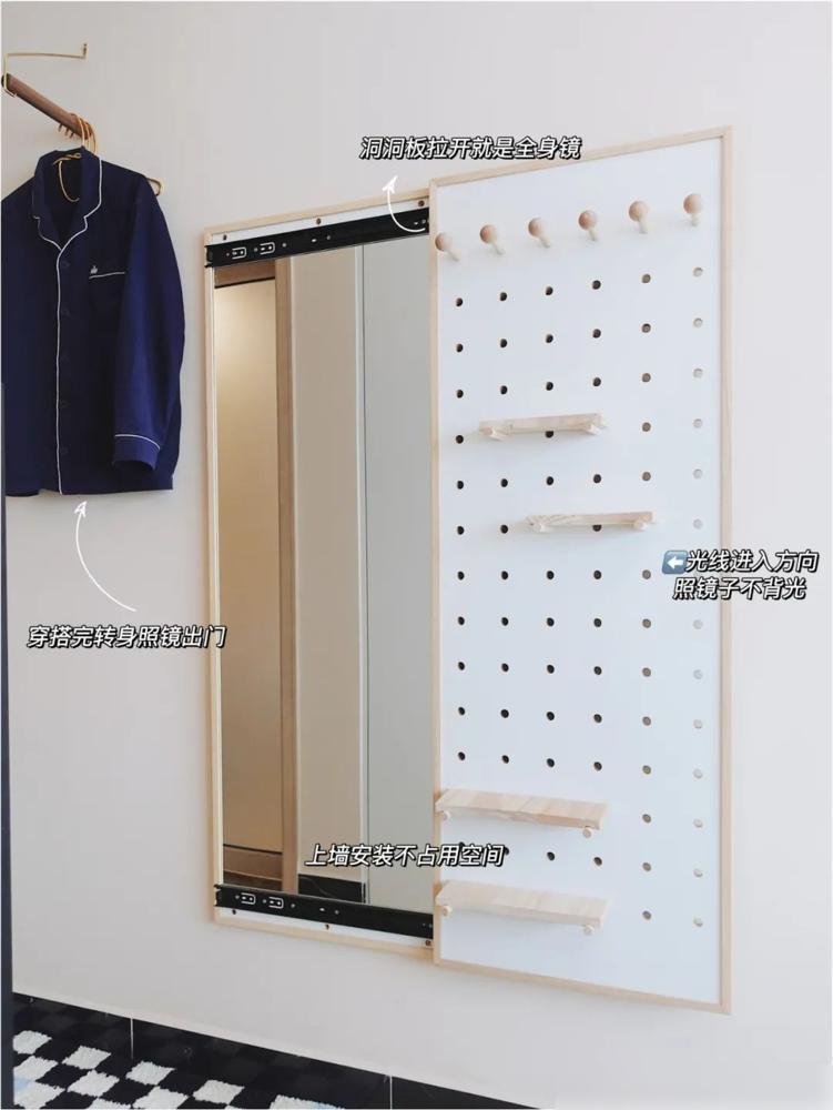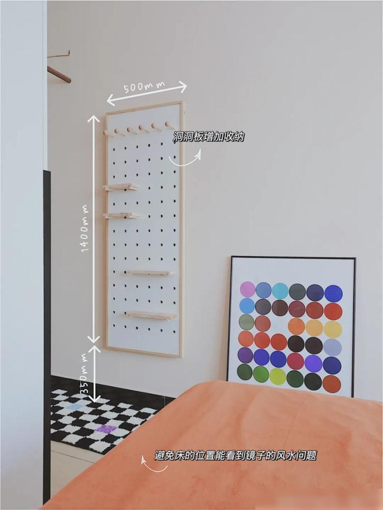 我建议郭大小姐将这面墙设计成“洞洞板”样式,这样就可以根据需要随意添加壁挂式衣帽架、悬挂式收纳袋等各类存取物品的用具,从而实现高效的大规模收纳。